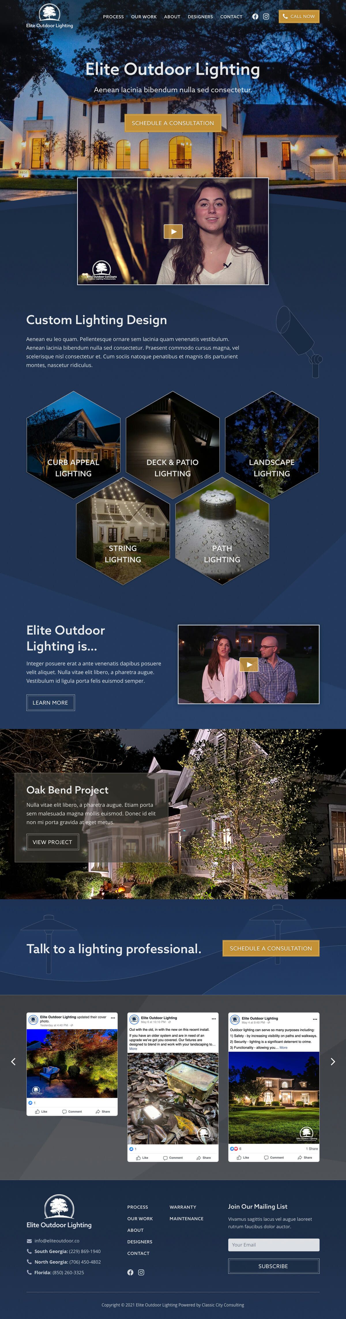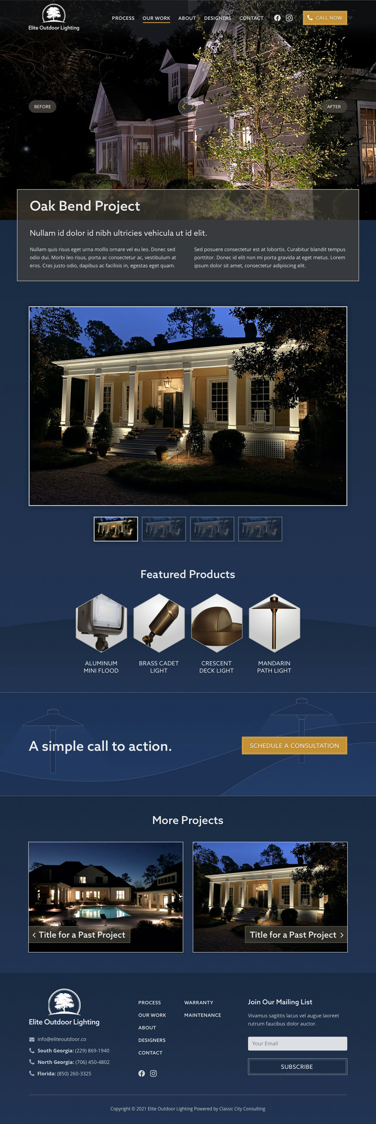 Design Website Designed the home page and interior page templates for the Elite Outdoor Lighting website. Elite Outdoor Lighting Home Page Elite Outdoor Lighting Project Page