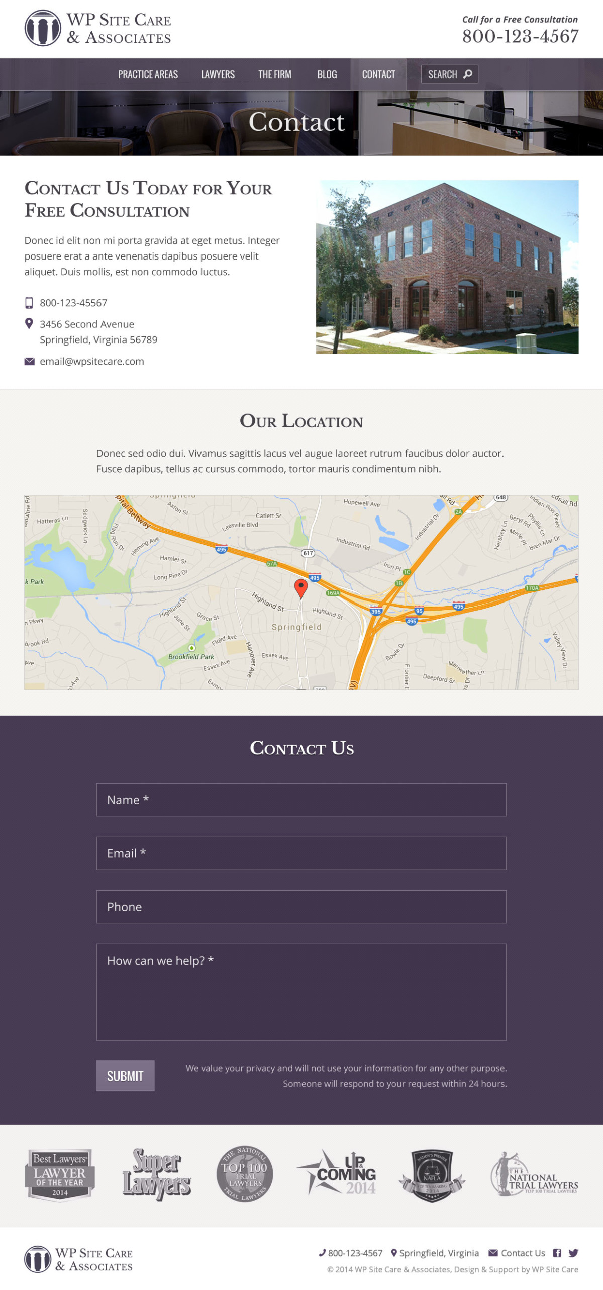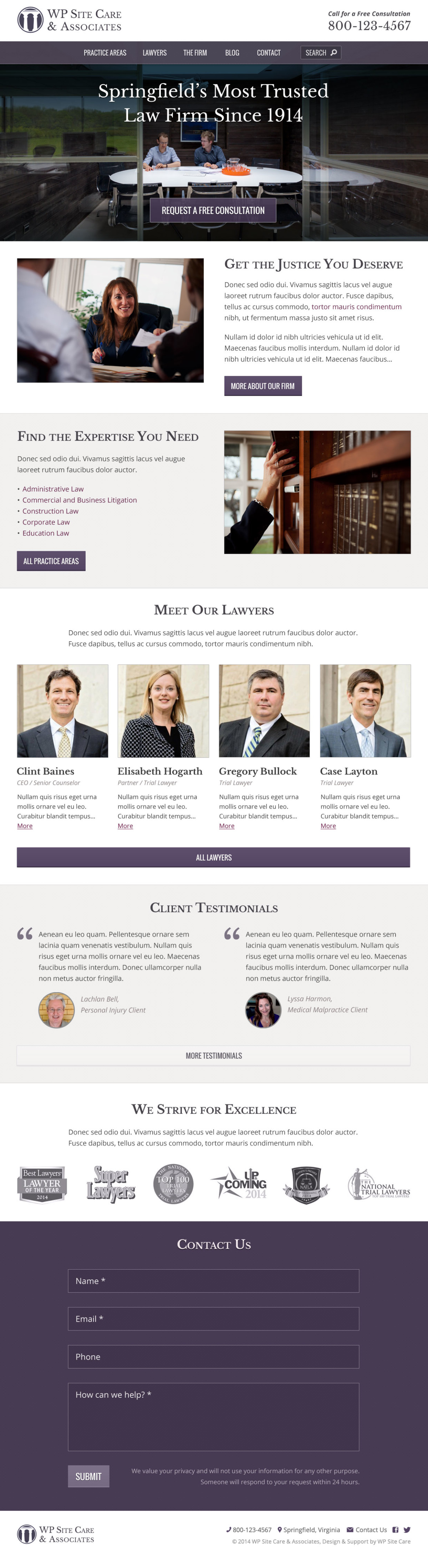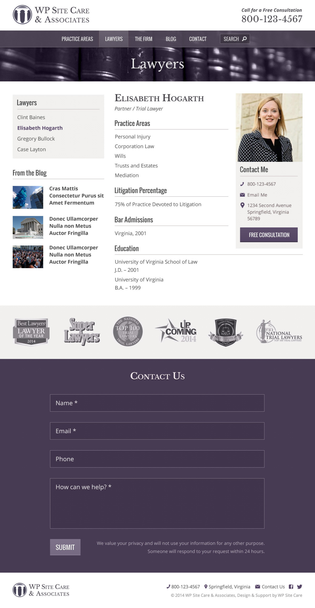 Design, WordPress Designed mockups for a responsive WordPress theme for law firms. Home Page Profile Page Contact Page